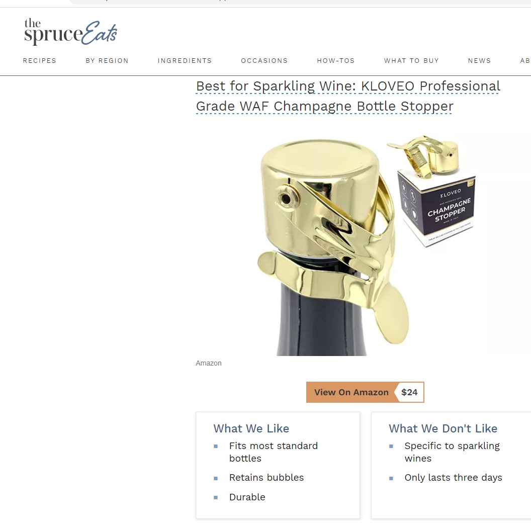 The editors at The Spruce Eats call Kloveo one of “The Best Wine Stoppers to Keep Your Bottles Fresh.” They named it the best for sparkling wine, pointing out its durability and the features that allow it to retain bubbles. The Spruce Eats comes with huge bragging rights for a brand looking to stand out in a sea of kitchenware.
