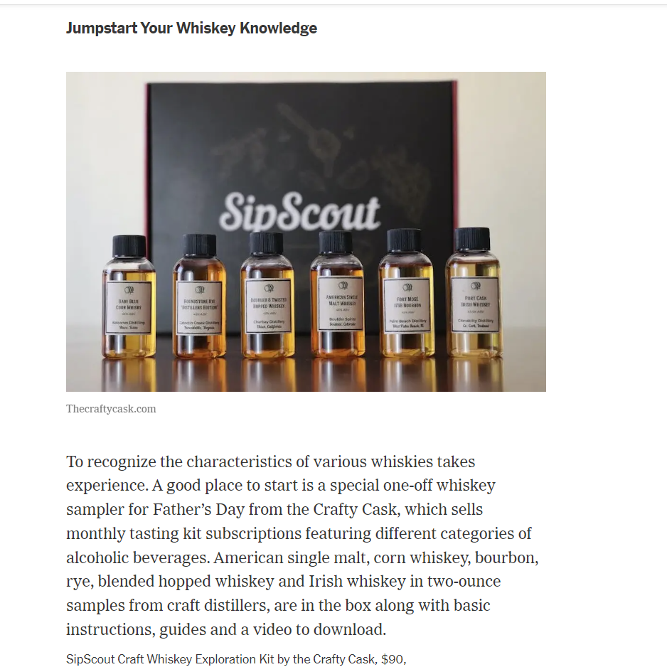 Orca Communications is overjoyed to see our client The Crafty Cask’s SipScout Whiskey Sampler included in a Father’s Day feature in The New York Times. The product was featured on the Front Burner page. We call this a huge PR win!