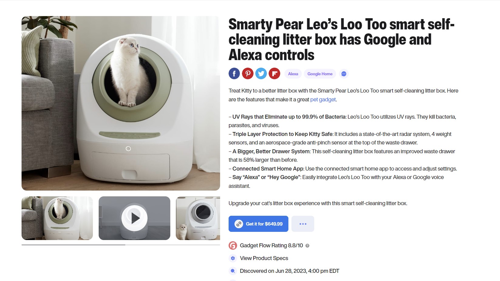 Gadget Flow calls itself the “original product discovery platform,” so imagine our excitement when we learned the product guide outlet did a Discovery Listing for Leo’s Loo Too, the smart self-cleaning litter box!
