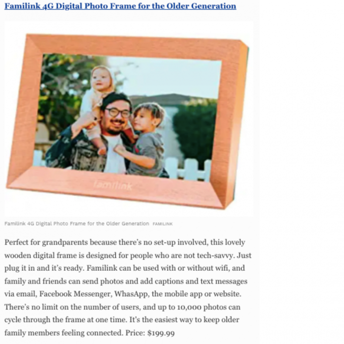 There are few better feelings than landing three clients in Forbes in one month. Here’s an example of a long-lead placement. Our publicists pitched this Forbes writer nearly a year ago. They loved the Familink digital photo frame, so they held onto it until they had an editorial fit for it. Turns out, it was perfect for this Mother’s Day Gift Guide.