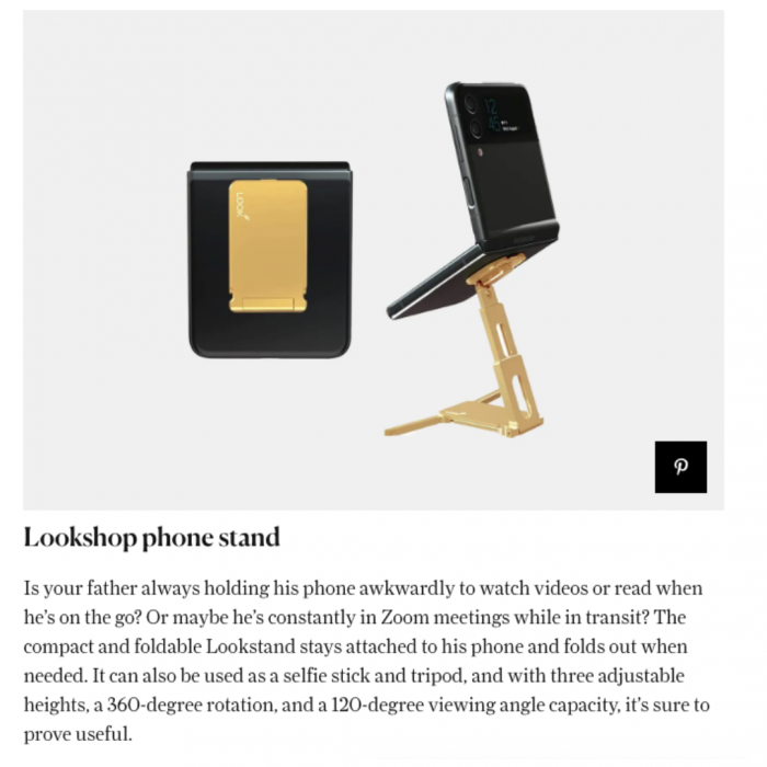 Dads can be influencers too! What better way to use your phone for meetings, streaming or taking videos for social media than the Lookstand! Conde Nast Traveler Online featured the Lookstand in the Father’s Day Gift Guide.