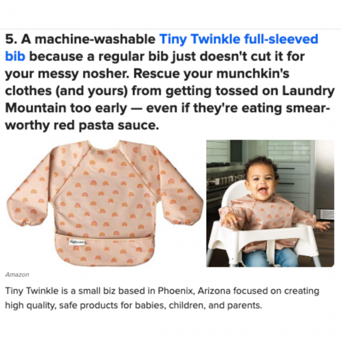 What a match: Buzzfeed loves a list — and Tiny Twinkle loves appearing in them! Thanks to Buzzfeed’s parenting team including Tiny Twinkle’s bibs in a list of “Practical Parenting Products that You Should Just Own Already.” Buzzfeed has 39 million unique views on its website each month.