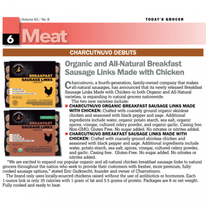TODAY’S GROCER magazine is the premier publication for over 20,000 chain and independent food owners and operators. Charcutnuvo debuted their new breakfast sausages in the May issue, getting their product seen by over 20,000 people in the grocery industry.