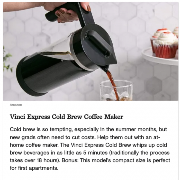 Getting that college diploma is also the perfect time to graduate to a stronger home coffee setup! Glad to see CNET.com include the Vinci Express Cold Brew Maker in this roundup of the best college graduation gifts of 2023. We love seeing our clients get a nod in top-tier publications like this.