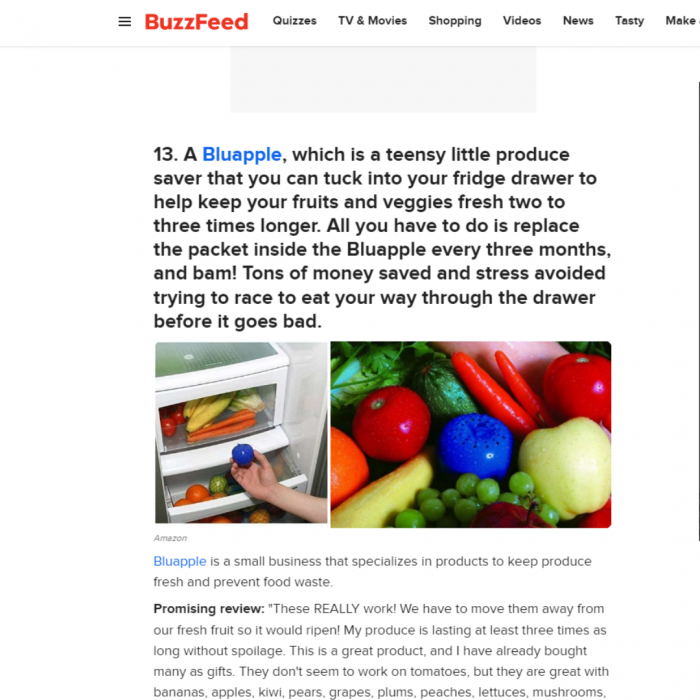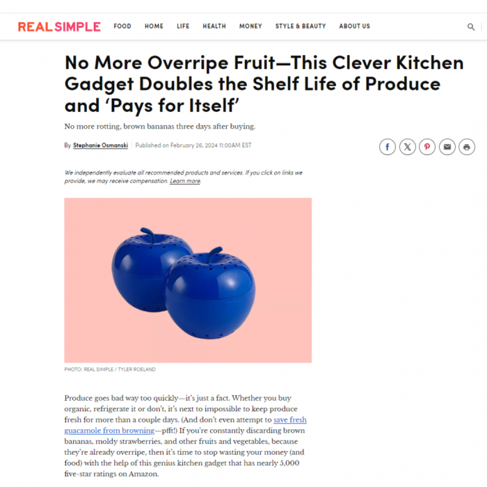 Real Simple also took a liking to Bluapple, a product that extends the shelf-life of your produce. They published a piece saying the $15 kitchen gadget pays for itself!