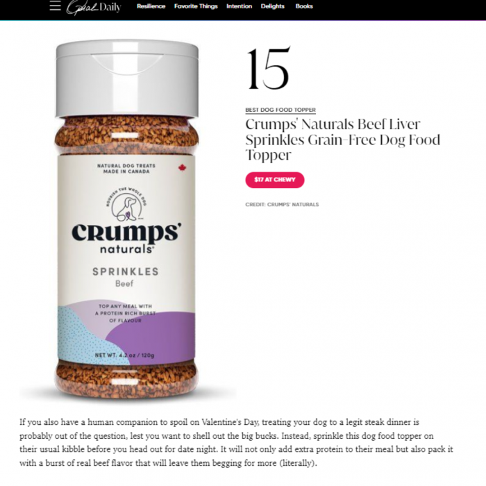 It’s never a rough day when OprahDaily.com features your Beef Liver Sprinkles in their “These Valentine’s Day Gifts Are Perfect For Spoiling Your Fury Bestie” article! The writer says, “If you also have a human companion to spoil on Valentine’s Day, treating your dog to a legit steak dinner is probably out of the question, lest you want to shell out the big bucks. Instead, sprinkle this dog food topper on their usual kibble before you head out for date night.”