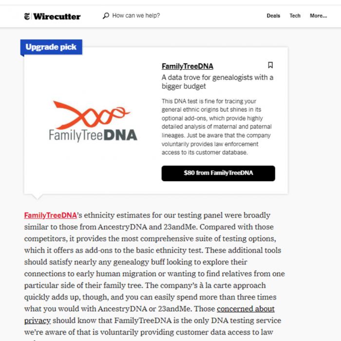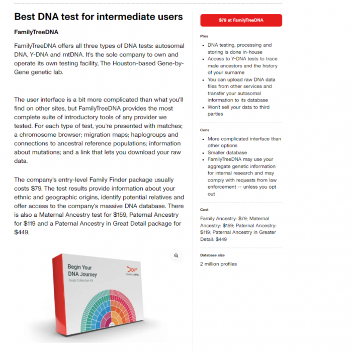 Wirecutter, CNET, Sports Illustrated, and TechAdvisor all recommend FTDNA