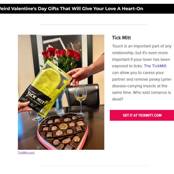 “Get RomanTICK on Valentine’s Day!” is what our publicist wrote in the pitch. David Moye from HuffPost loved it! He included the Tick Mitt in his Valentine’s Day gift guide. Now, there’s nothing weird about getting rid of ticks and protecting yourself from serious illnesses like lyme disease, but you have to admit, it would be an unusual gift to give on Valentine’s Day.