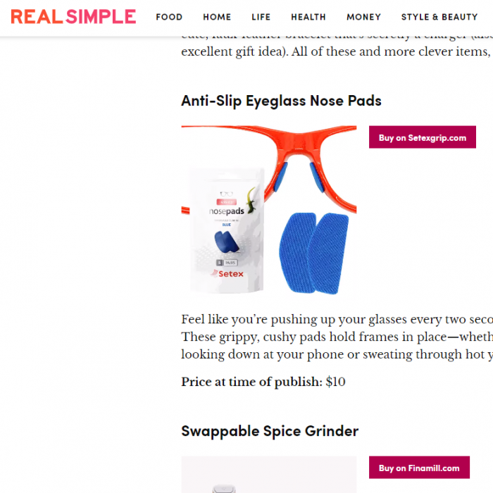 Speaking of product roundups, Real Simple included Setex Eyeglass Pads in a story about clever items that simplify life. In addition to publishing the product roundup for the 5-million+ viewers who visit RealSimple.com every month, the article will also be published in Real Simple Magazine, which has a 2-million print circulation.