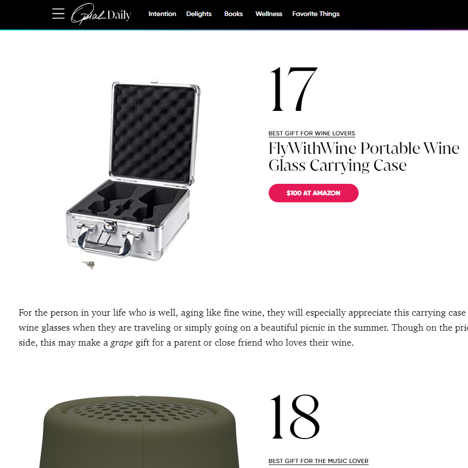 Orca Communications publicists made sure the editorial team over at Oprah Daily got a chance to try the innovative FlyWithWine wine glass-carrying suitcase. They liked it and added it to a guide for 50th Birthday Gift Ideas.