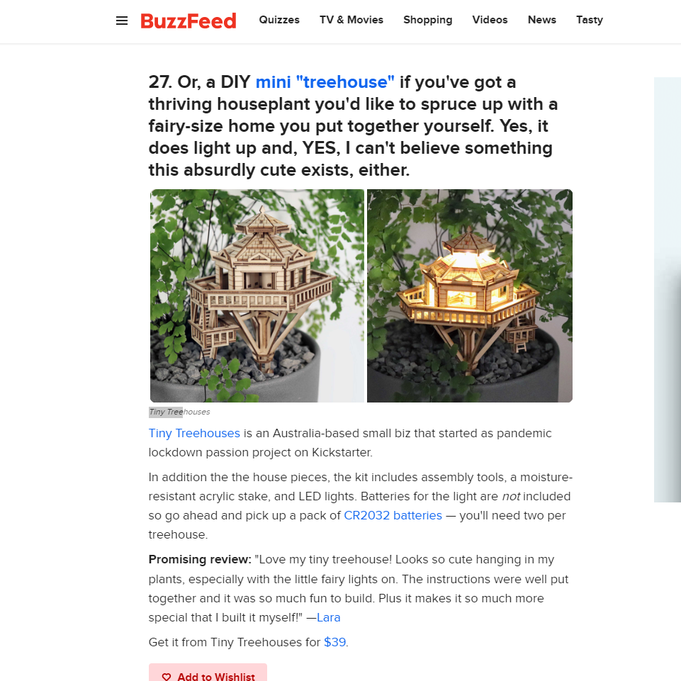 Unique just never seems to go out of style! Thanks to Buzzfeed for featuring the one-of-a-kind Tiny Treehouses yet again, in this roundup titled, “If I Were President, I’d Make Sure Everyone Had These 31 Products.” Buzzfeed is the king of listicle-style product roundups and we are always pleased when an Orca client makes the cut!