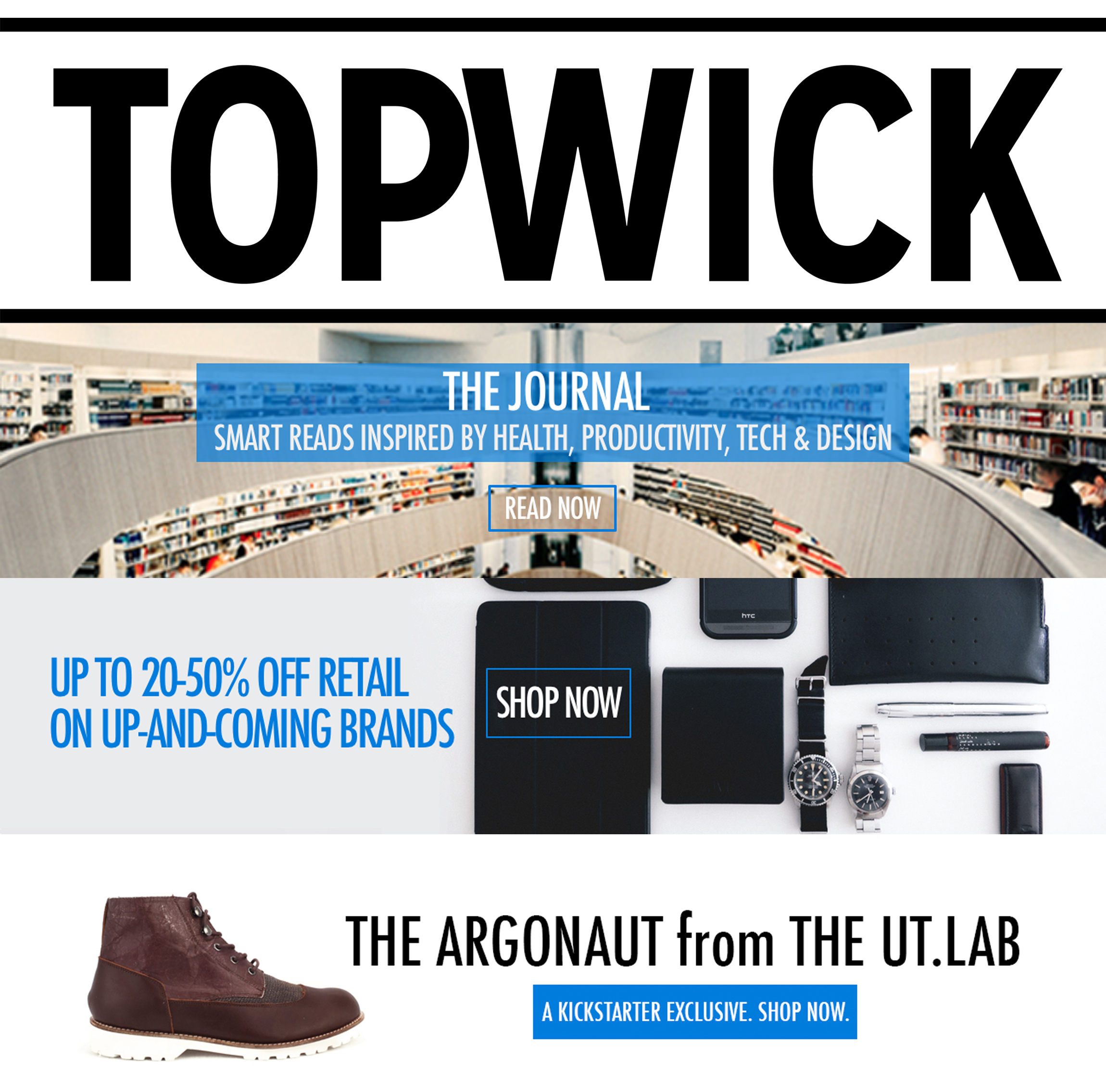Offer: Cyber Monday Deal: ModNotebooks- 15% off. Ministry of Supply Aeon Sweater- 20% off. The digital destination of lifestyle finds just for men. From magnetic tech gadgets to moisture-wicking sweat pants, Topwick offers products from some of the top up and coming innovative lifestyle brands that are revolutionizing the marketplace. Products rotate in and out about every two to three weeks giving shoppers fresh new, cool picks to choose from. Regular prices start at $39.www.topwick.com.