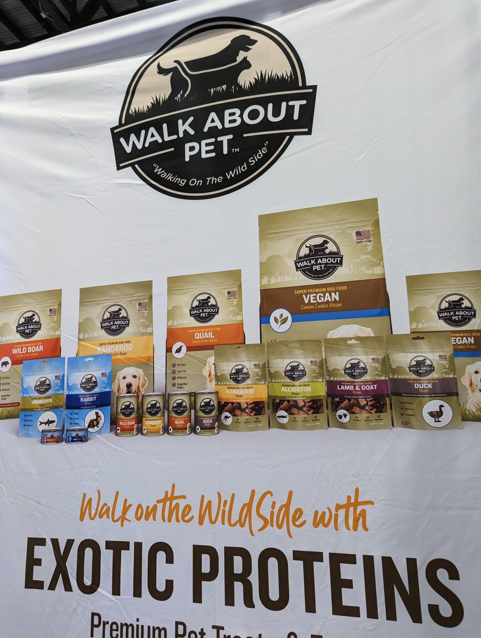 Walk About Pet showcases exotic proteins like kangaroo and alligator in their pet foods.