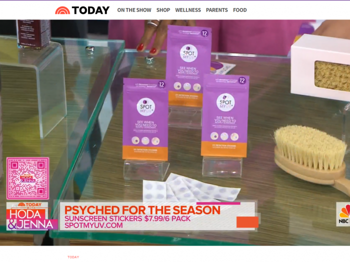 Levine let us know that she got a call from The TODAY Show to do a Spring Guide called, Psyched for the Season. We sent her SPOTMYUV, a sticker that you put on your skin, apply sunscreen, and the sticker uses technology to tell you when to re-apply! The TODAY Show absolutely loved SPOTMYUV and asked us to create a visual graphic of what the SPOT looks like clear and then what the SPOT looks like in purple and put them side by side so the SPOTMYUV graphics department worked with them to get them what they needed.